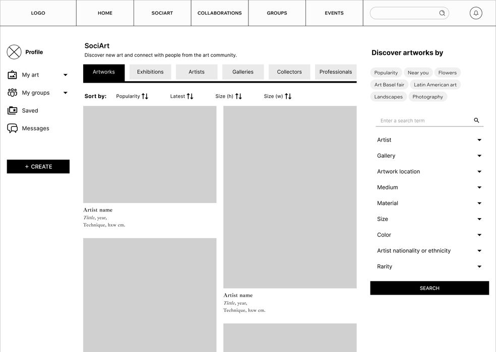 My biggest challenge was creating a profile page that caters to the needs of the four main personas: artists, galleries, collectors, and professionals. The goal was to customize each profile to meet the unique needs of its user while ensuring no relevant information was left out.